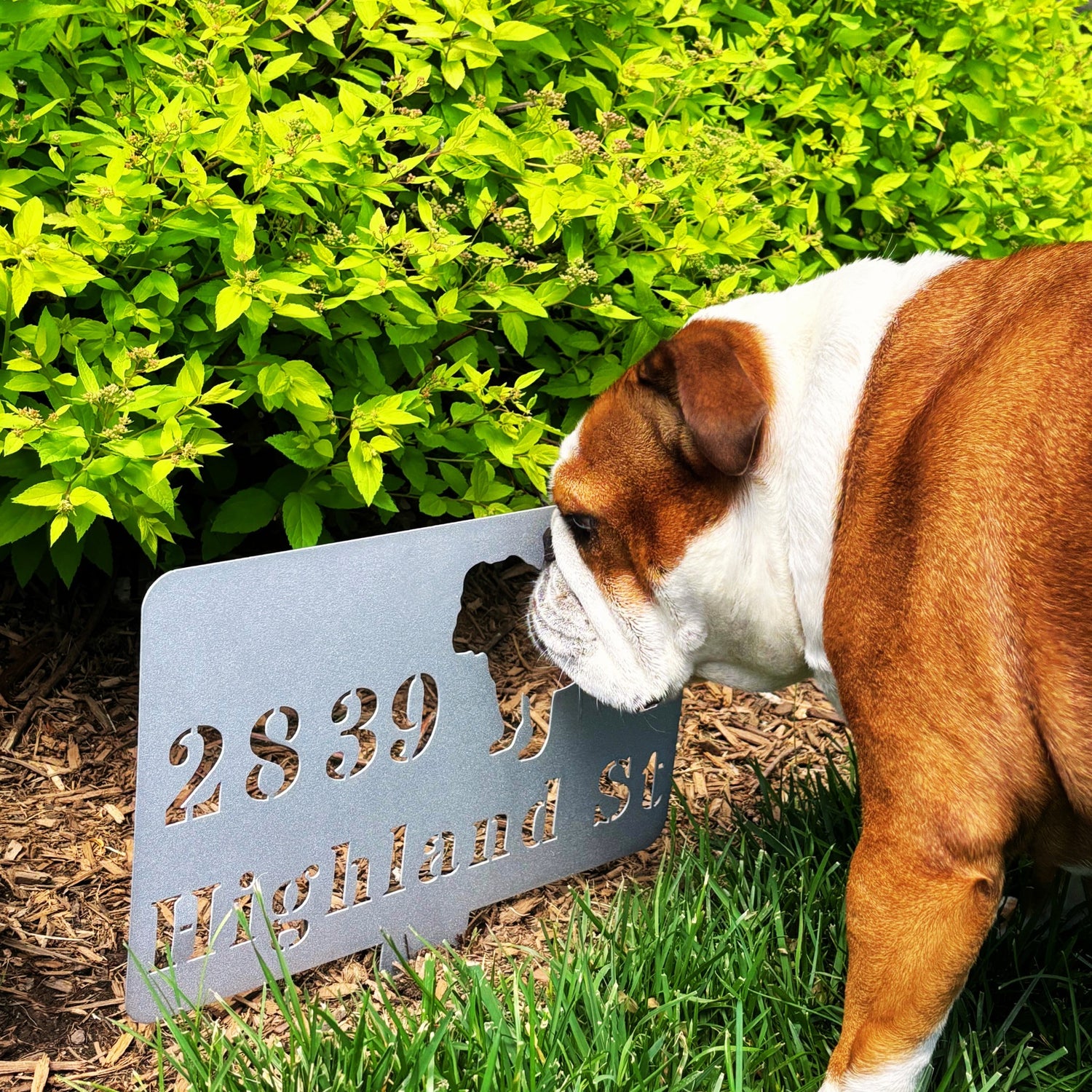 This lawn sign features a proud English Bulldog with prominent house numbers, adding a touch of practicality to its whimsical design.